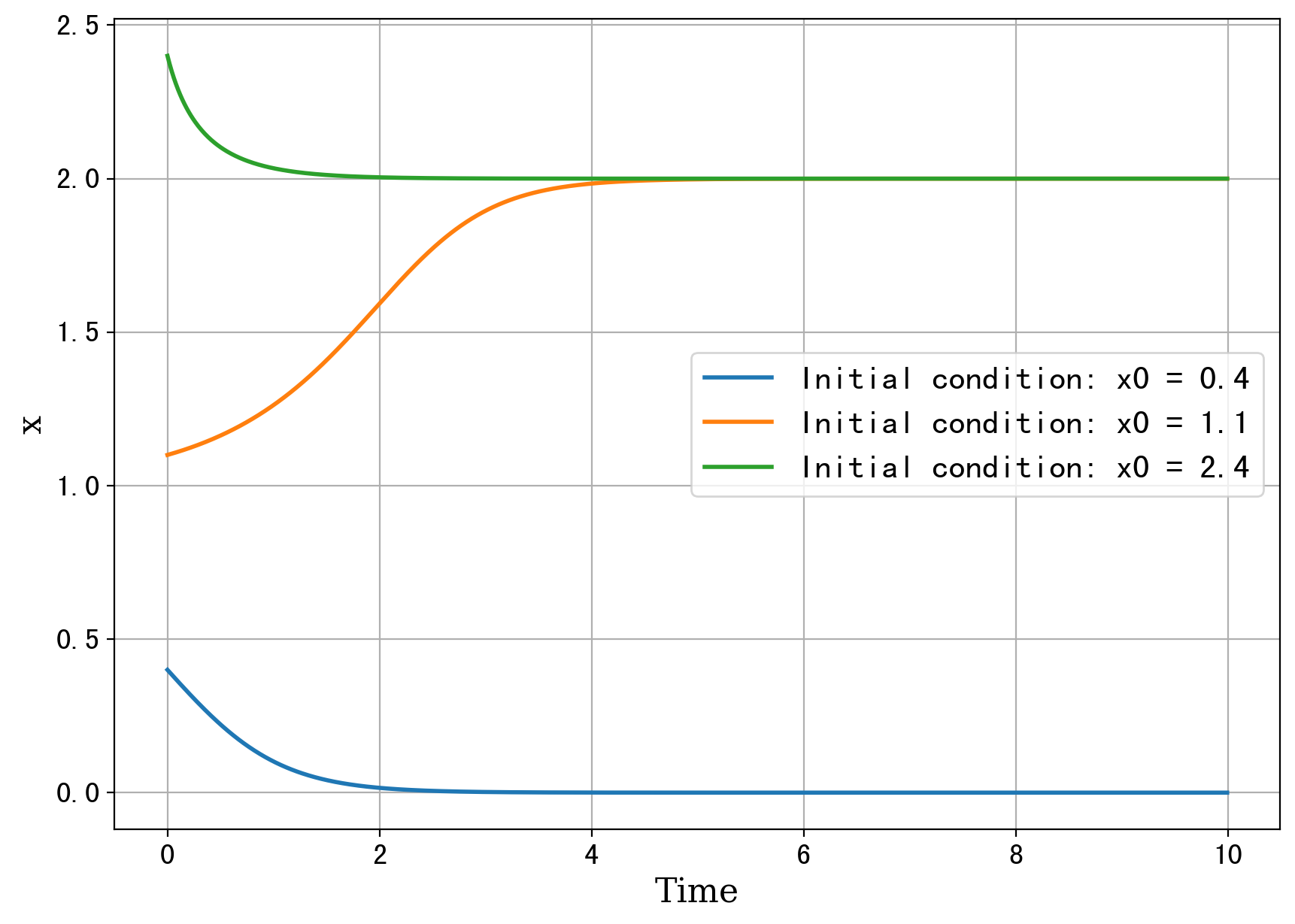 Example: Consider \begin{equation} x^{\prime}=-x(x-1)(x-2) \tag{3} \label{eq:equilibrium} \end{equation} Set the RHS equal to $0$ $\Rightarrow$ three equilibria: $0, 1, 2$.